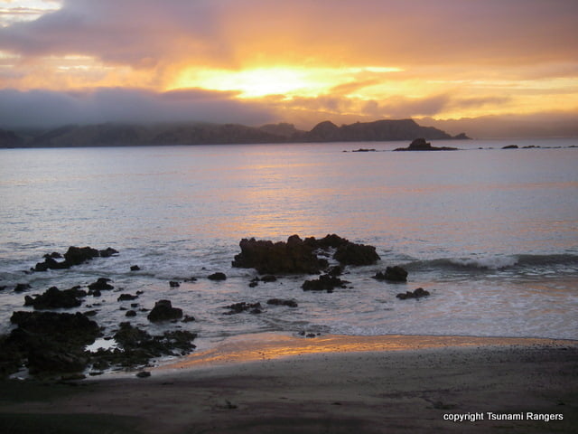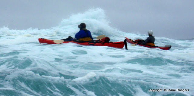 Two cool fishing dudes were staying with us at the hut, Chris and Dean. Like me, Dean had artificial valves implanted in his heart, so he and I swapped scars and stories. Apparently, there was a cyclone somewhere in the area, and we got a bunch of big waves and some storm conditions. Of course we went kayaking Tsunami Ranger style and Mark proved that he could paddle through rock gardens in nine-foot seas. He passed his officer test and became a bona fide Tsunami Ranger. He had to wait only 20 years!