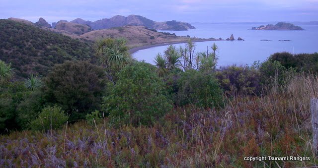 After a long and terrible plane ride from San Francisco, we arrived at the Auckland airport in New Zealand feeling very tired. After waiting six long hours in the airport, we took a puddle jumper ride north to Keri Keri where our host Mark Hutson picked us up in his van, drove us to his house, loaded us up with kayaking gear and shuttled us and three of his friends to Matauri Bay. We packed our Puffin boats (I let Jim have the pink one) and set off for a three-mile paddle to Motukawanui, an island in the Cavalli Island group in the Bay of Islands.