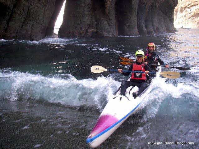 The mission of the Tsunami Rangers is to explore surf and rock gardens—that is, coastlines, the more rugged, the better. We also further the sport and lifestyle of coastal kayaking and educate interested paddlers who want to go beyond their current skill level. Not a club with dues and social interaction, we’re a team and recruit people with mutual interests after we’ve paddled with them in various kayaking environments for a year or more. At the right time, after much practice in controlled conditions, we offer them a chance to formally prove their mettle and become a Tsunami Ranger officer.