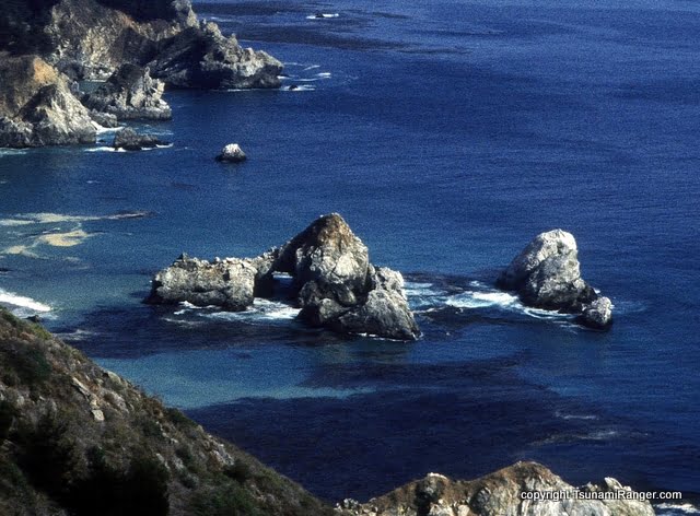 About 25 years ago, Tsunami Rangers Jim Kakuk, Glenn Gilchrist, and I toured down the northern and central Big Sur coast. We camped at a hidden little beach, fished for ling cod, and explored in detail the complex rock garden we named Neptune’s Castle. We climbed the pyramidal islet (see the photo), and placed a bottle with a message in it on top. We have not been there since.