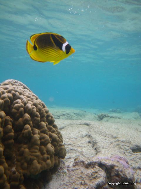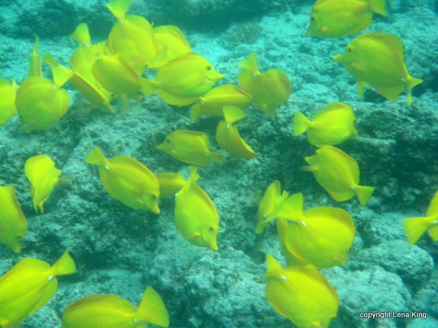 After thirty minutes of easy paddling I was slipping into the water with Maya, my 12-year-old fish/child and trying to kick over to the pod of dolphins, which included many leaping and spinning juveniles! This was, as it turns out, only the beginning of the ocean’s treasures revealed to us. We made our way toward the 15-foot white monument that marks the spot where Captain Cook was killed on Valentine’s Day, 1779. There was a small crowd of people over there, so we paddled into the nearby underbrush, and in the process I noticed what appeared to be lots of yellow leaves on the bottom of the crystal clear 20-foot deep sea floor. After we ditched the boats and begin snorkeling, the saffron leaves begin darting about in groups, being of course not leaves but Laui Pala or Yellow Tang fish.
