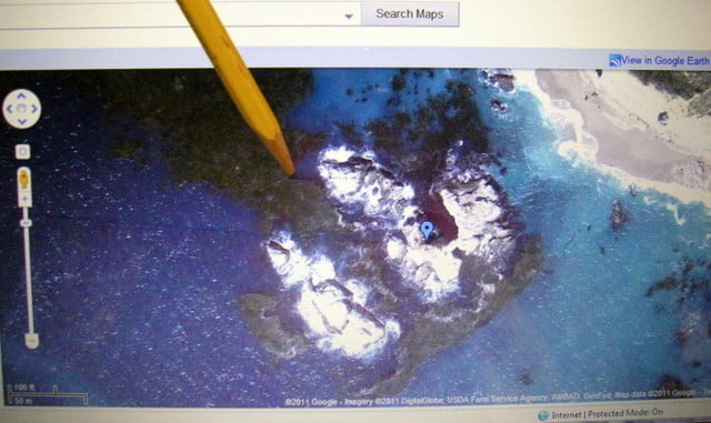 Additionally, it is a snap to go online to Google Earth and view a satellite photo of any place in the world you might want to kayak. Say we wanted to check out a specific rock garden on the Big Sur coast. We could find it using Google Earth, as depicted in the photo above of a certain Neptune’s Castle.