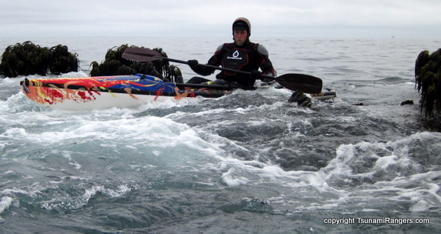 Moulton, while intinctively this might seem to be true, I don’t think it is. I’ve been speared a couple of times and have experienced several boat collisions, but have very rarely hit my body on a rock with any force. I’ve scraped the hull of the boat over rocks a fair number of times, but not my body. Which is not to say it couldn’t happen of course! But when I’m kayaking in the surge among rocks or in the surf zone with other kayakers, I consider those other boats to be the biggest threat to my safety.