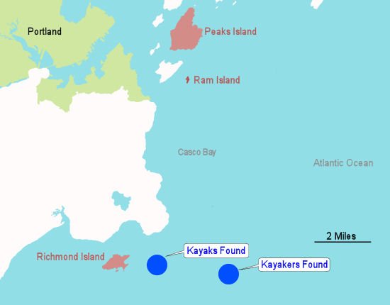 As any pilot can attest, it’s not easy to spot small objects from the air. Nevertheless, by 8:30 pm both kayaks had been located, floating in the open ocean roughly seven miles South of Ram Island, and about a mile SSE of Cape Elizabeth. One kayak was upright and contained a jacket and T-shirt; the other was upside-down. Irina and Carissa were nowhere in sight.