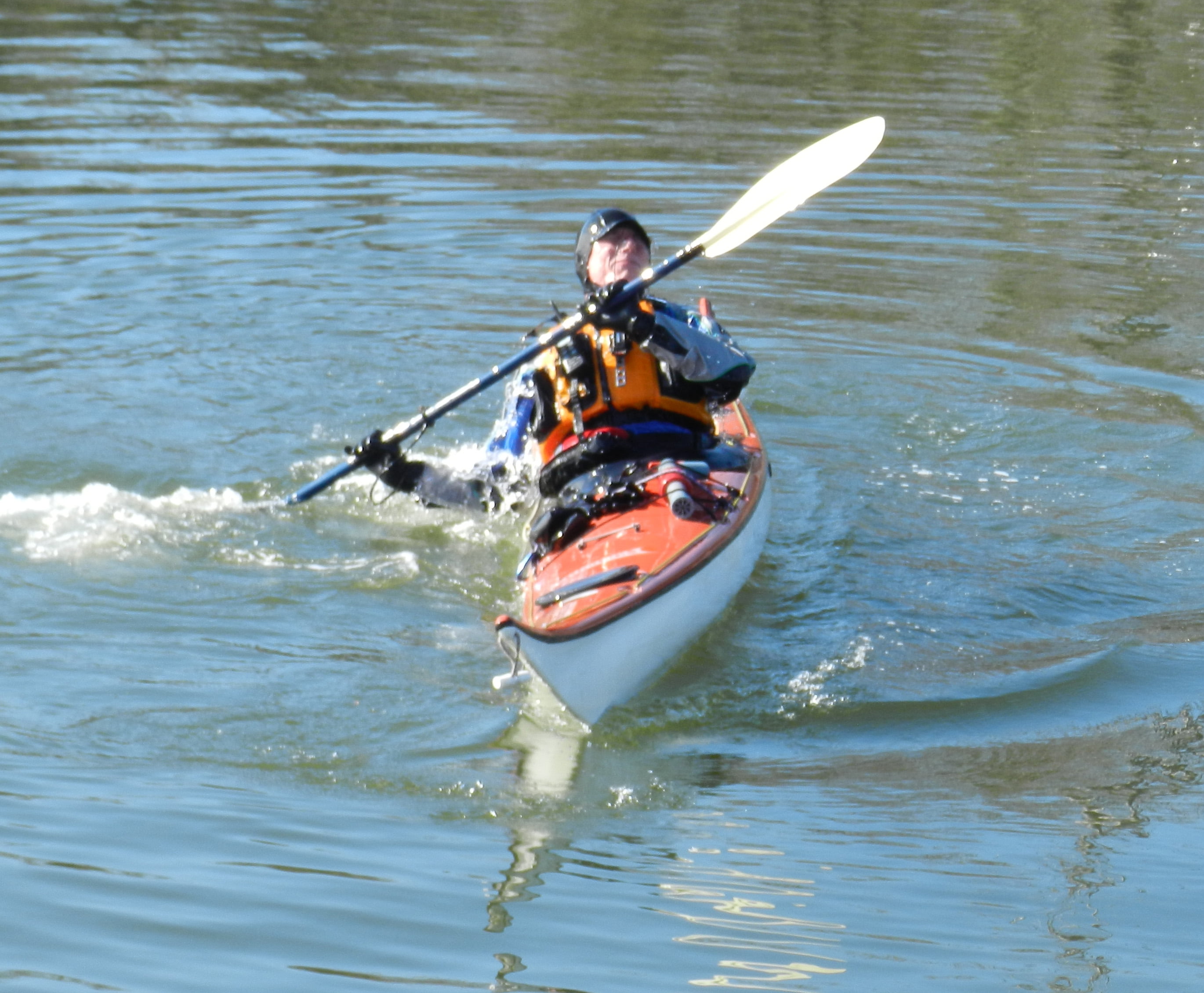 Nancy, that brain freeze happens to me if cold water contacts my forehead. I suspect that your helmet protected you in that respect. In the rolling picture above, I wasn’t wearing my neo hood; just the neo hat with brim. That worked fine as far as the brain freeze, but without the hood, enough cold water got to my ears that I couldn’t do more than 2 rolls in succession without pausing a minute to let the ears warm up. No vertigo, but definitely short-duration ear ache. One thing that Eric’s mellow yellows is that they would have eliminated both re-wetting of his hands from wave splash and, more importantly, heat loss due to evaporation of water from is hands.