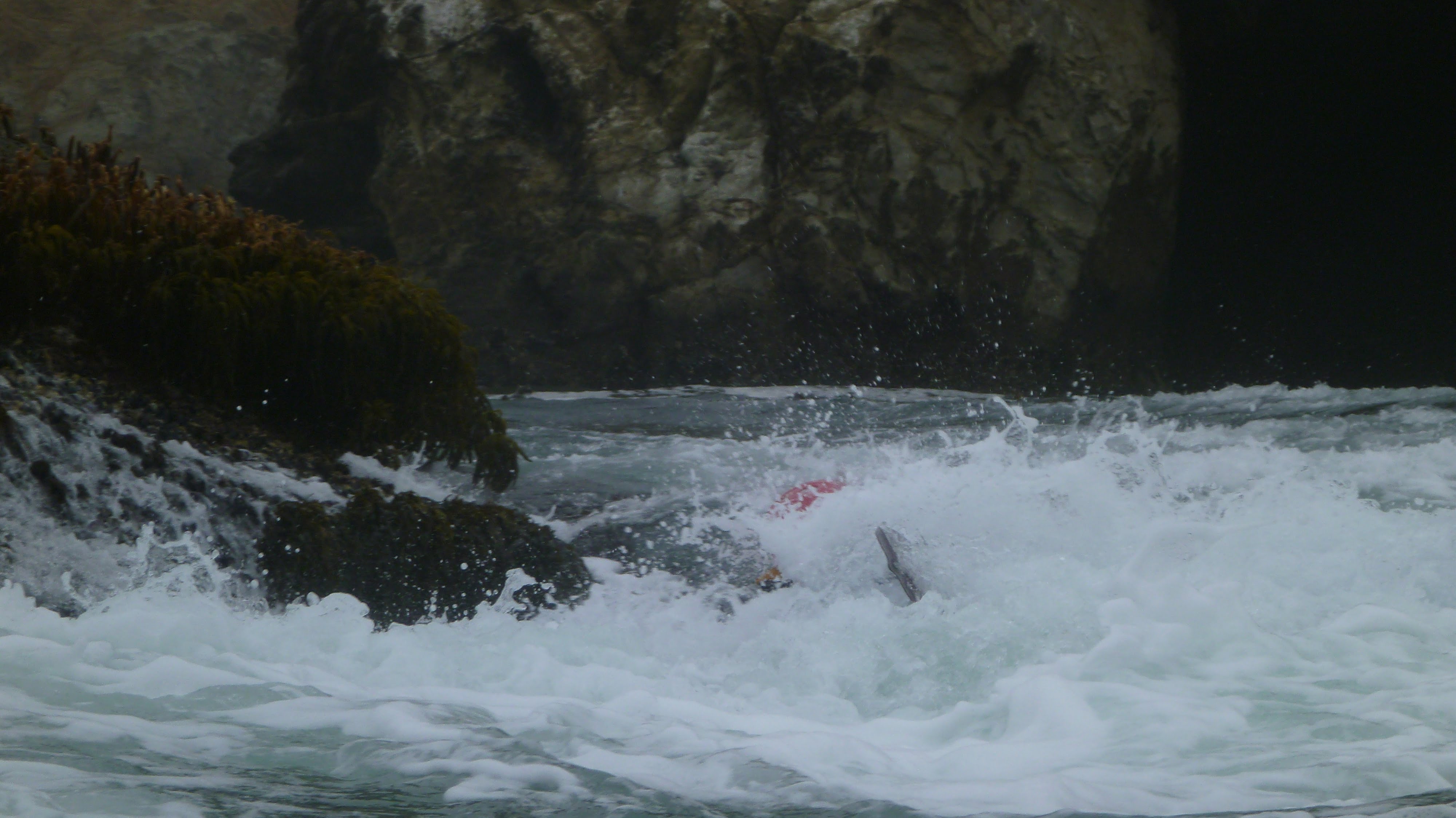 The local surfers and kayakers are outfitted with wetsuits and drysuits. Surfing and kayaking wouldn’t be much fun if they weren’t. Actually, surfing and kayaking wouldn’t be possible. People who don’t dress for immersion are not in kayaks but boats with engines. And they’re usually the ones who tip over and have a problem. I think the bigger issue is that newer kayakers don’t expect to tip over and end up in the water. That’s where education begins. Just like you don’t learn to walk without falling down, you don’t learn to kayak without falling in. A good teacher will instruct students that they WILL end up in the water at one time or another, and that’s what you prepare for. As Moulton says in his Golden Rules, prepare for the worst that can happen. If teachers aren’t getting that across, they’re not doing their job. When I learned to kayak the first thing Eric made me do was fall out of my boat and get back in over and over about a hundred times. First on flat water in the harbor, then in surf. I think the longest swim I ever did was about 45 minutes It was a rough day, I was in a double with a friend, and we couldn’t stay upright. We spent about an hour or so out by Mushroom Rock, most of that time in the water. In my wetsuit I never got cold. Ever. Because I was comfortable and I’m a good rough water swimmer it was actually fun. Perceived risk was low. My biggest worry was sharks.